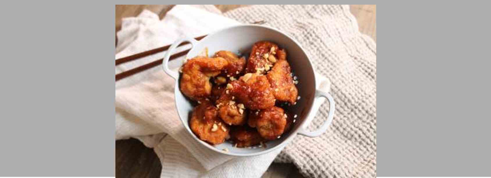 Dakgangjeong close - 4 filets de filets de poulet - 50g de farine - 50 g de fécule de maïs Maïzena - 50 g de chapelure - 2 oeufs - Huile de friture - Cacahuète torréfiées - Sel ou sel fin Pour la sauce - 1 gousse d'ail pelées et râpées - 4 c. à s. de sauce soja - 4 c. à s. d'eau - 2 c. à s. de miel - 2 c. à s. de ketchup - 1 c. à s. de vinaigre de riz ou vinaigre japonais - 2 c. à c. de pâte de piment rouge Gochujang