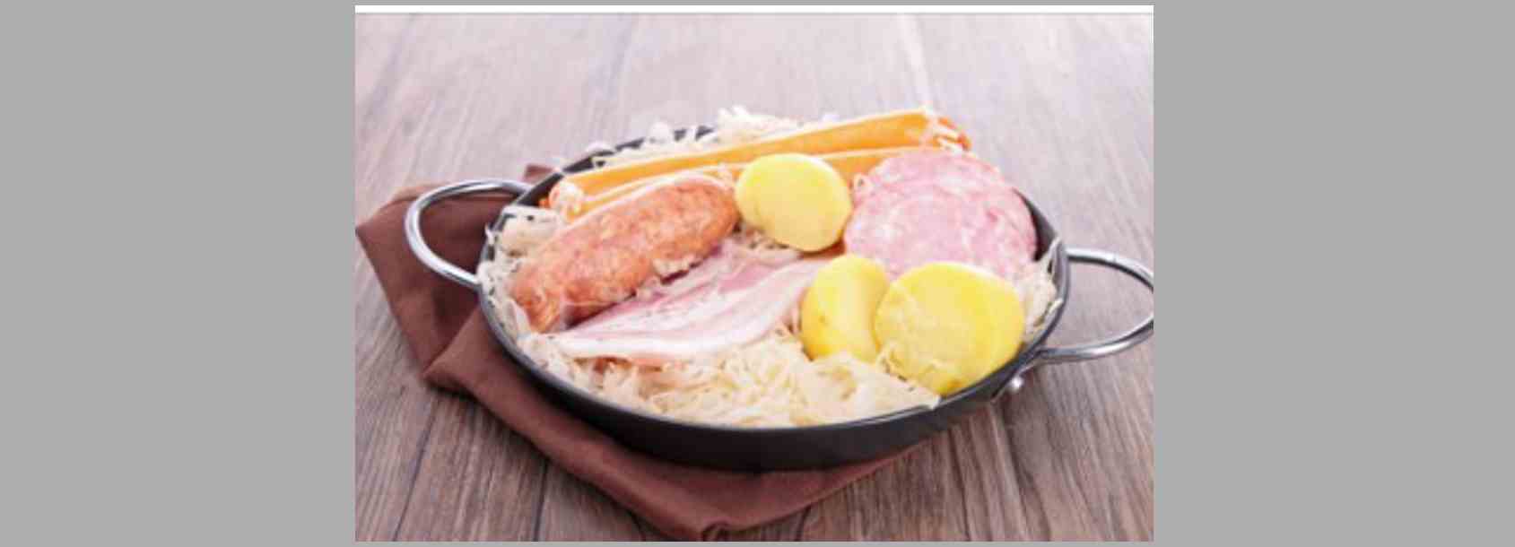 La Véritable Choucroute Alsacienne close - 1,5 kg de chou à choucroute crue environ (250 g par personne environ, on peut aller jusqu'à 300 g) - 1 oignon - 10/15 grains de genièvre - 1 tablette de bouillon Viandes : - 500 g de rôti de porc fumé (filet de Kassler) ou de palette fumée environ - 300 g de lard fumé environ - 2 saucisses de Montbéliard (fumées) que l'on peut couper en deux A cuire en dernier : - 1 saucisse de Strasbourg par personne - (1 cervelas) - 1 bouteille de Riesling - 500 g de pommes de terre à chair ferme Ne pas saler